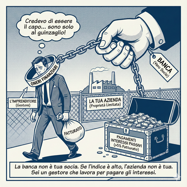 La banca non è tua socia. Se il tuo indice è alto, l’azienda non è tua. Sei un gestore che lavora per pagare gli interessi. Festeggiare un grosso fido è come festeggiare l’aver comprato un guinzaglio più lungo. Un’azienda che si finanzia con debito per la gestione ordinaria è tecnicamente fallita.