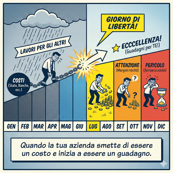 Il Mese di Indipendenza (o Giorno di Libertà) segna il momento esatto dell’anno in cui smetti di lavorare per pagare fornitori, dipendenti, banche e Stato, e inizi finalmente a generare ricchezza per te.